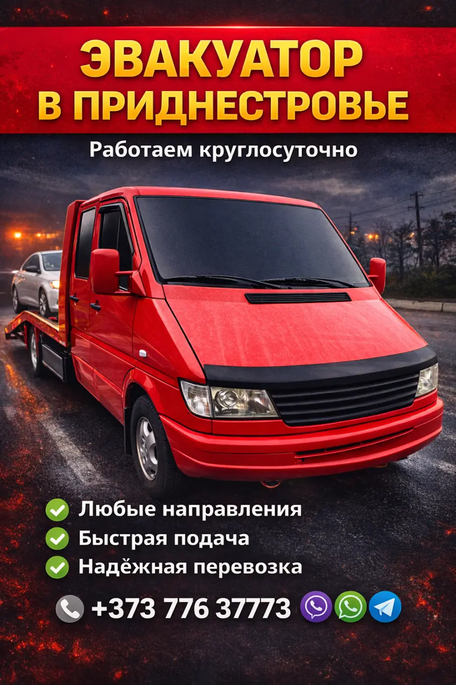 Если автомобиль сломался или попал в ДТП — мы приедем и аккуратно доставим ваш автомобиль. ✔ Работаем 24/7 ✔ Перевозка авто до 5 тонн ✔ Быстрая подача ✔ Работаем по ПМР и Молдове 📞 Звоните: 0776 37773 Viber • WhatsApp • Telegram